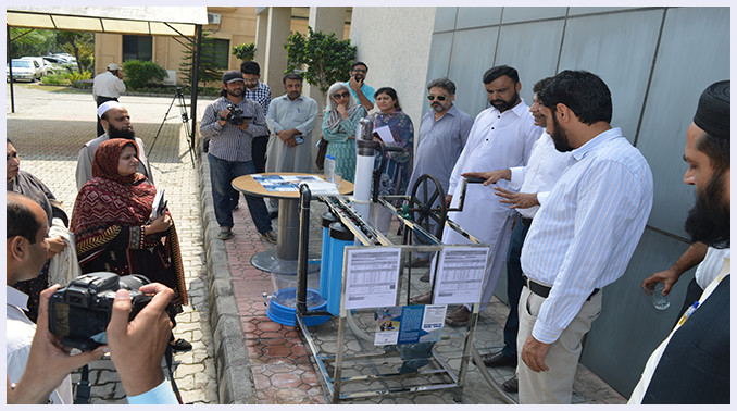 This briefing was followed by demonstration of various models of rainwater harvesting. Dr. Naveed Iqbal, Director (Hydrology), PCRWR provided further insight about different models developed by PCRWR at its premises including; roof-top rainwater harvesting for horticulture, soakway pits and artificial groundwater recharge. Dr. Hifza Rasheed, Secretary-PCRWR, explained about the innovative and low-cost water treat filters developed for flood affected areas to meet drinking water requirements.