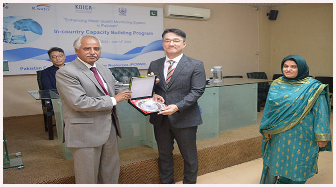 Mr. Jeho Yeon, Director KOICA, Dr. Jaewon Choi/ K-Water and Ms. Heejung Son, Senior Manager Capacity Building K-water graced the event with their presence. Dr. Hifza Rasheed, Director General PCRWR delivered the welcome address, in which she presented the brief overview of the training program and the prevailing water quality scenario of Pakistan. Dr. Muhammad Ashraf, Chairman PCRWR emphasised on importance of Human Resource development to improve their performance and productivity. Mr. Jey-Won Choi explained the objective of the project ‘Enhancing SDG 6 Water Quality Monitoring in Pakistan’, to extend cooperation on enhancing water quality monitoring and to improve the capacity of the Government of Pakistan to achieve SDG 6 with a cost of 7.42 million dollars from 2019 to 2024. Moreover, KOICA is providing water quality testing equipment and training to PHED (Public Health Engineering Department) laboratories and enhancing MIS (Management Information System) in Punjab and KP provinces. Moreover, Ms Heejung Son gave an overview of the Master Training Program conducted in K-Water academy Korea. She also appreciated the efforts of PCRWR and K-Water Team for arranging an In-Country capacity building training program. At the end of the event Souvenirs were distributed among K-water team for their efforts to make this project successful.