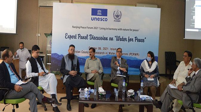 The expert panel discussion was organized as a link to Nanjing Peace Forum 2021 “Living in harmony with nature for peace”. In Pakistan, the expert panel discussion was organized by PCRWR in partnership with UNESCO Beijing and Pakistan offices on the subject “Water for Peace”. The Session was moderated by Chairman PCRWR. The panel of Experts included: Dr Mohsin Hafeez, Country Representative International Water Management Institute (IWMI), Pakistan; Engr. Ahmad Kamal, Chief Engineering Advisor/ Chairman Federal Flood Commission; Dr. Rashid Aftab, Director, Public Policy Institute, Riphah International University; Dr. Arjumand Nizami, Country Programme Director Pakistan, Helvetas Swiss Intercooperation, Brig (Retired) Fiaz Husaain Shah from NUST Institute of Peace and Conflict Studies, Mr. Ahsan Khan, Progressive Farmers, Local community member, Mr. Ubaid Qureshi, President Youth Parliament.